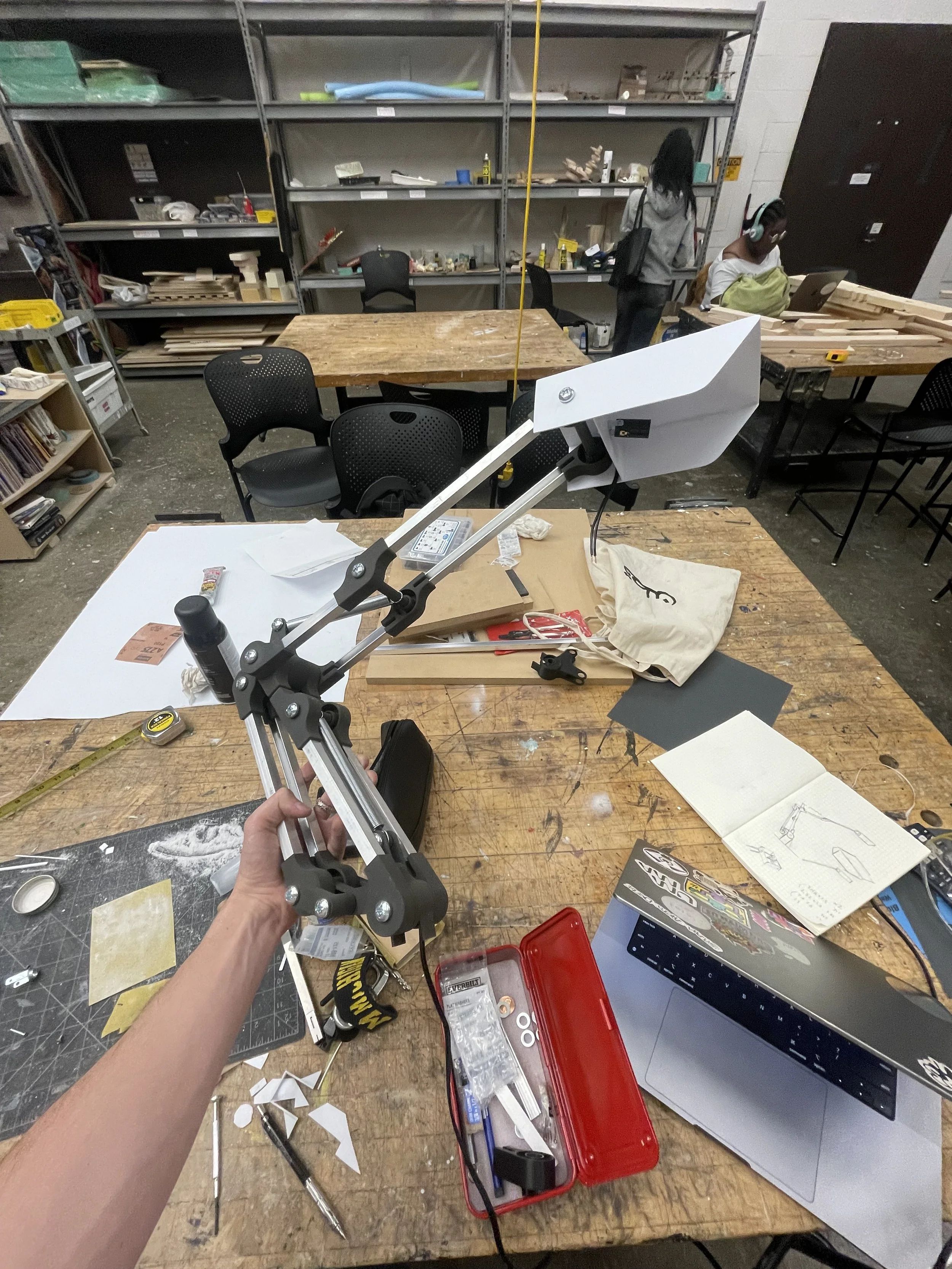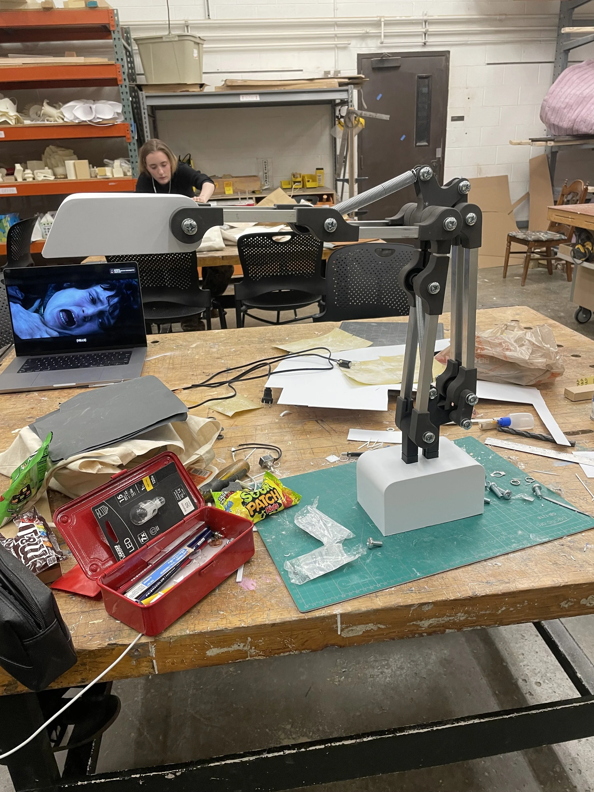 After some challenges with balancing the weight of the arm, I had a fully functional prototype and hand-fabricated the shade and base covering with polystyrene plastic.